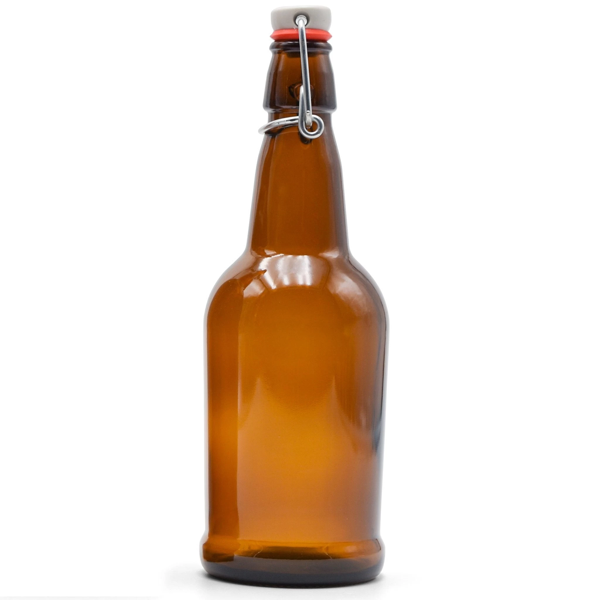 Our 16 oz. flip top brown glass swing top bottles seal with a plastic, gasketed lid and a wire bale (included). They come 12 per case, and ship in a cardboard case with dividers.