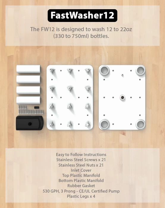 Until now, that is. Introducing the FastWasher12 — the hands-free, high-capacity bottle cleaner and sanitizer that will change your bottling game forever. Simply load 12 bottles onto the durable, brewer-designed rack, then turn on the washer and let the powerful pumps do all the hard work. No scrubbing. No nonsense. No mountain of empties to wash and sanitize by hand ever again!