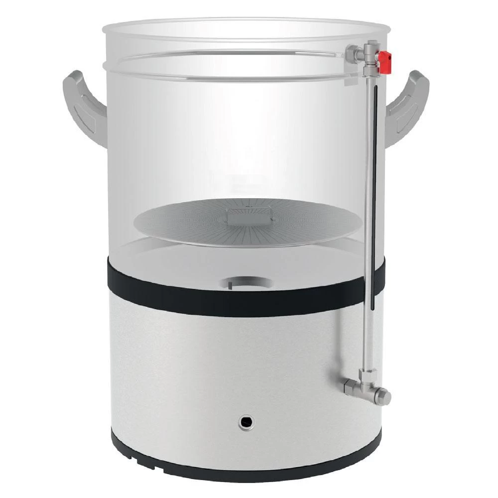 - Concealed conical heating element. Large, surface mounted 3300 W heating elements heat wort evenly and quickly. The element covers 80% of the base and it’s mounted using thermal paste rather than braised. This increases heat efficiently, by minimizing heat loss in areas it’s not needed. The wide heating area minimizes hot spots and scorching. Most solids settle on the false bottom, not the elements, making clean-up a breeze.