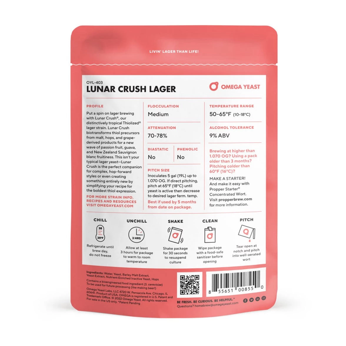 Lunar Crush Lager is the latest patent-pending strain in Omega’s Thiolized™ series. Lunar Crush biotransforms thiol precursors from malt, hops, and grape-derived products for a new wave of passion fruit, guava, and New Zealand Sauvignon Blanc fruitiness. This isn’t your typical lager yeast—Lunar Crush is the perfect companion for complex, hop-forward styles or even creating something entirely new by simplifying your recipe for the boldest thiol expression. Learn more about biotransformation here.