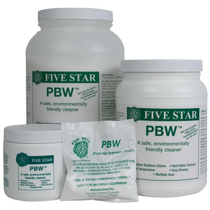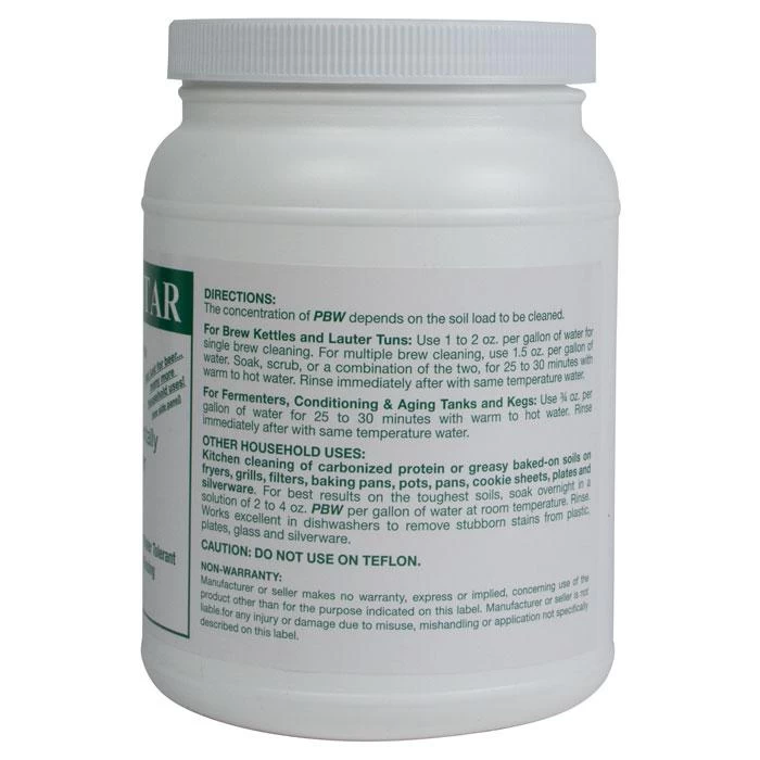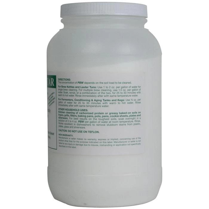 PBW (Powdered Brewery Wash) is a patented alkali cleaner originally developed for Coors, now widely used in commercial breweries across North America. Use 1 to 2 ounces per gallon for cleaning kettles, 3/4 ounce per gallon for fermenters, kegs, tanks, and other equipment. Soak equipment overnight in PBW solution; rinse the following morning – no scrubbing required! Will not damage rubber gaskets, soft metals, or your skin. PBW can effectively clean items that can not be reached with a brush or sponge, and is strong enough to remove thick, difficult, caked-on organic soils.